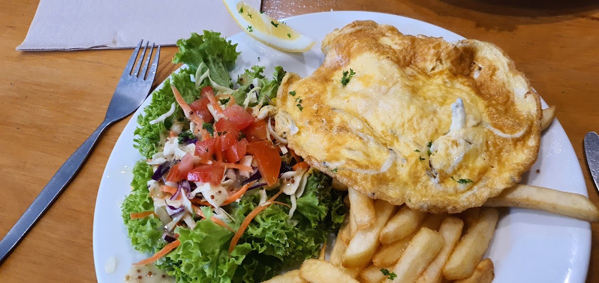 Whitebait fritter with some chips was good, so was the waffle. The service was very friendly and kept us informed when they had ran out of blueberries and needed to amend the order. Seating available indoors and outdoor. There is undercover eating at the back.